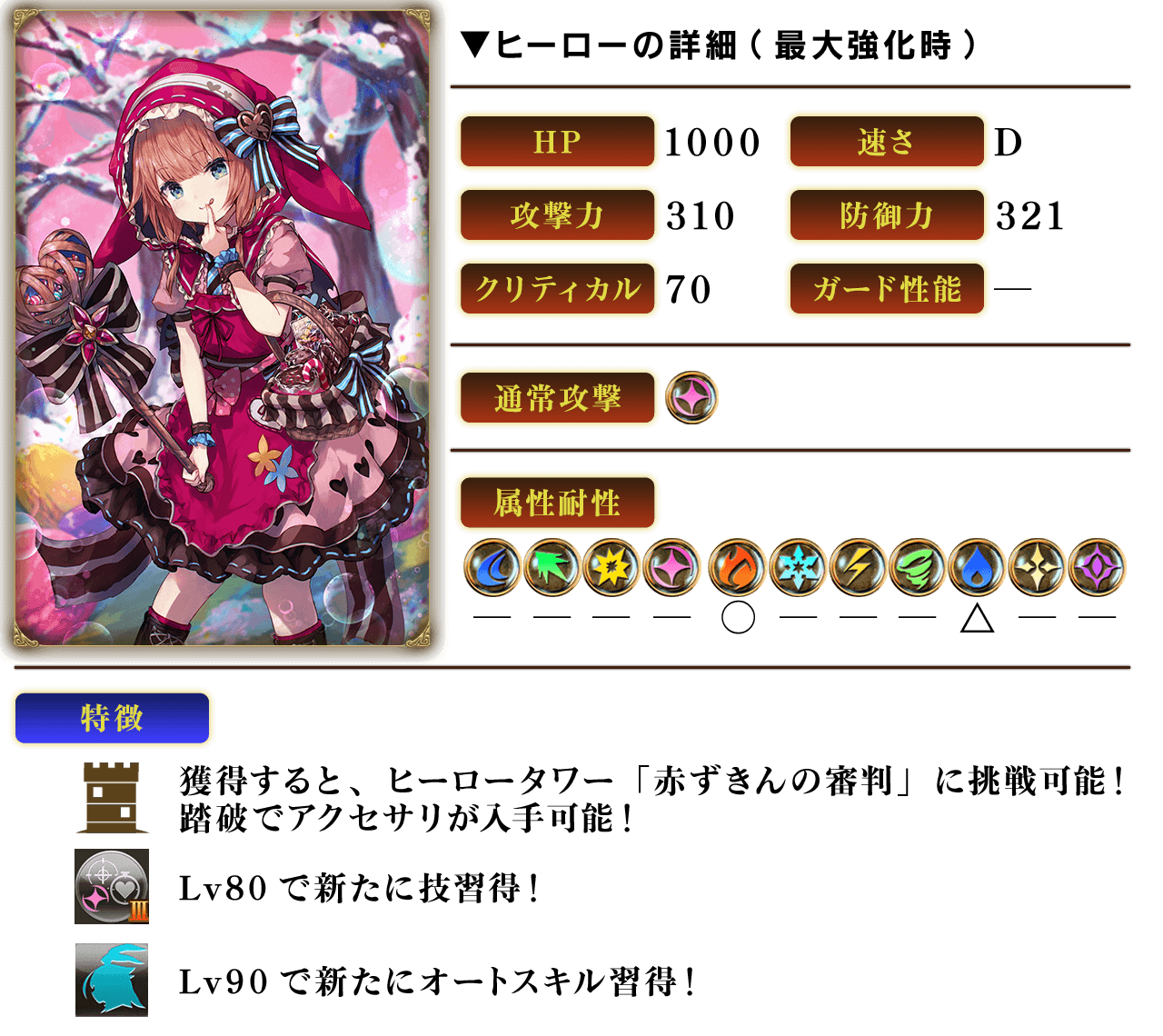 赤ずきん 画像-名前 赤ずきん レアリティ ★5 ロール アタッカー 属性 Pure CV 松岡侑里 絵師 こうましろ SDキャラ;メルヘン 赤ずきん グリム兄弟 昔、かわいい小さな女の子がいました。 誰でもその子を見ると可愛がりましたが、特におばあさんが一番で、子供にあげないものは何もないほどの可愛がりようでした。 あるときおばあさんは赤いビロードの頭巾をあげました。